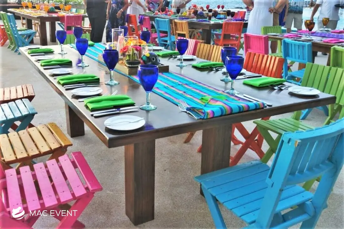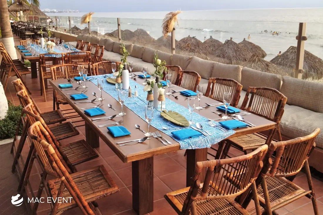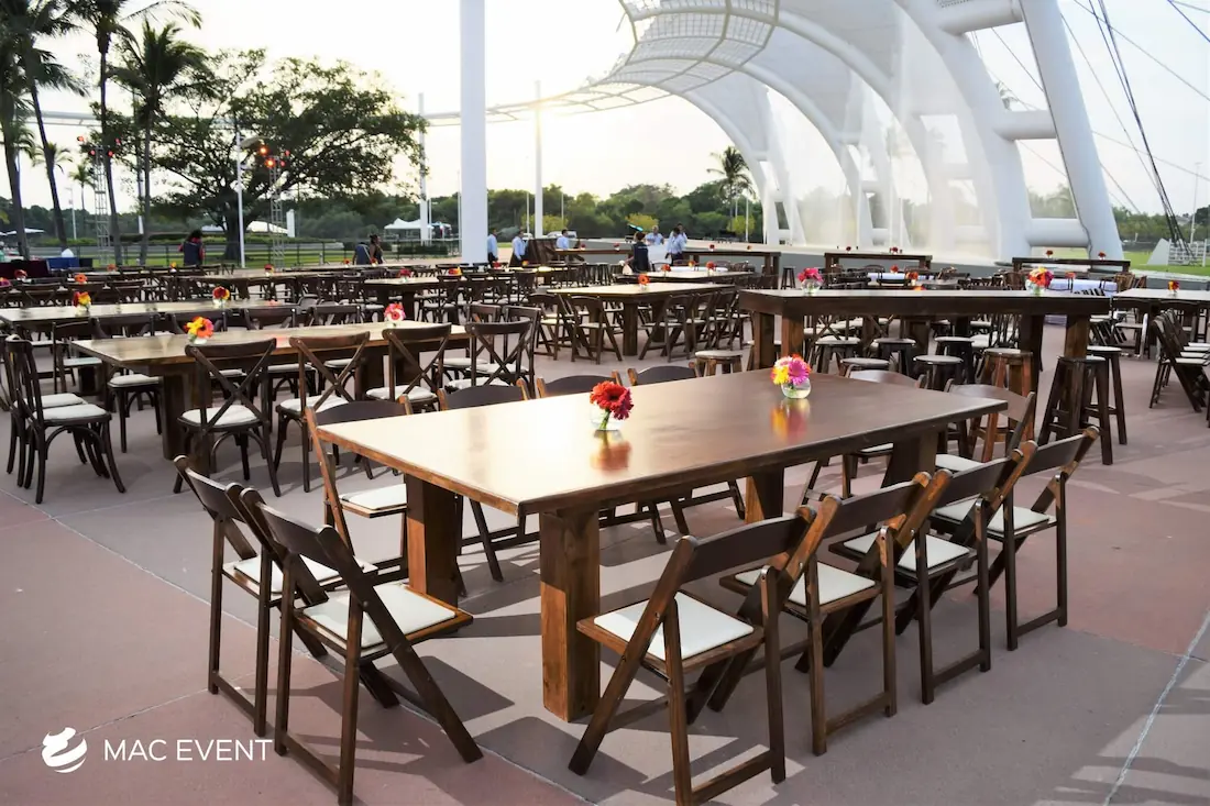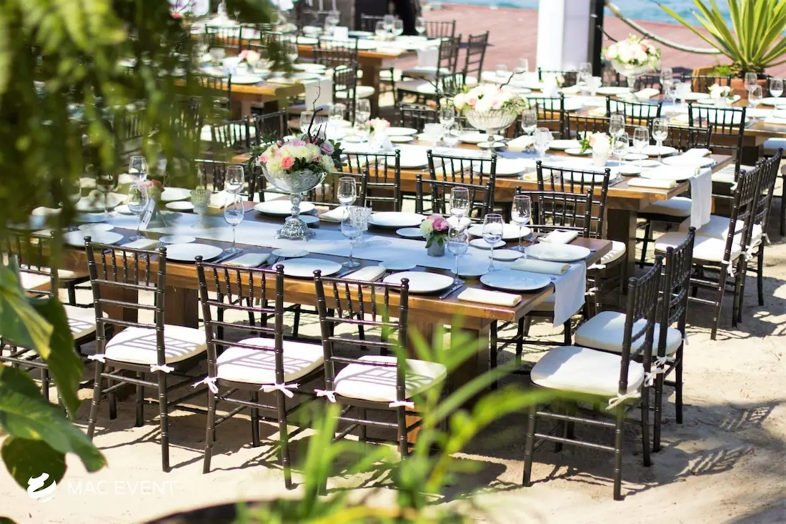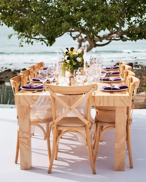 Renta de mesas rústicas rectangulares en Puerto Vallarta, Sayulita y Punta Mita para bodas y eventos. Perfectas para eventos con estilo campestre. ¡Haz de tu celebración algo especial con nuestras mesas rústicas!