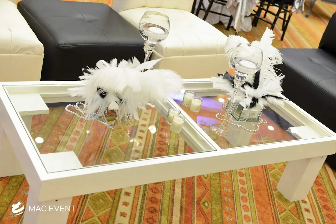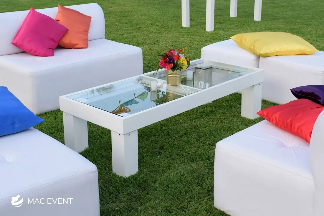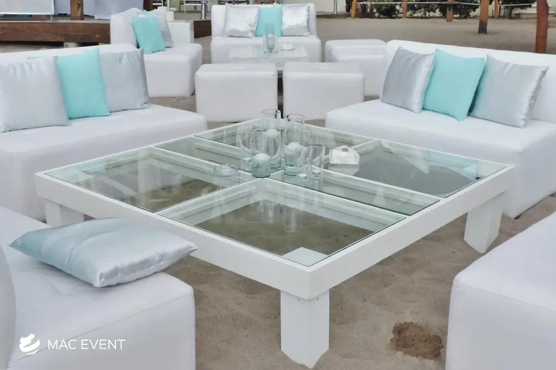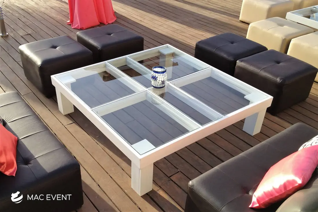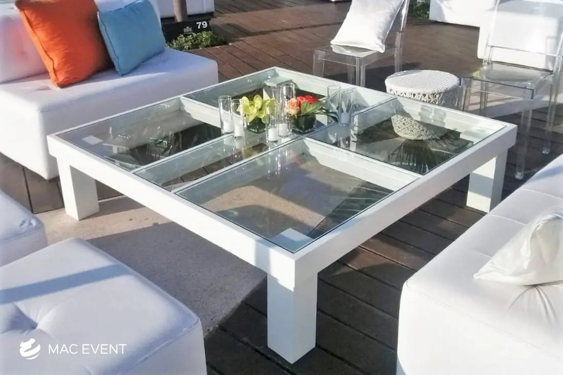Renta de mesas de centro de madera y cristal en Puerto Vallarta, Sayulita y Punta Mita para bodas y eventos. Combinan estilo moderno y clásico. ¡Dale un toque de distinción a tu evento!